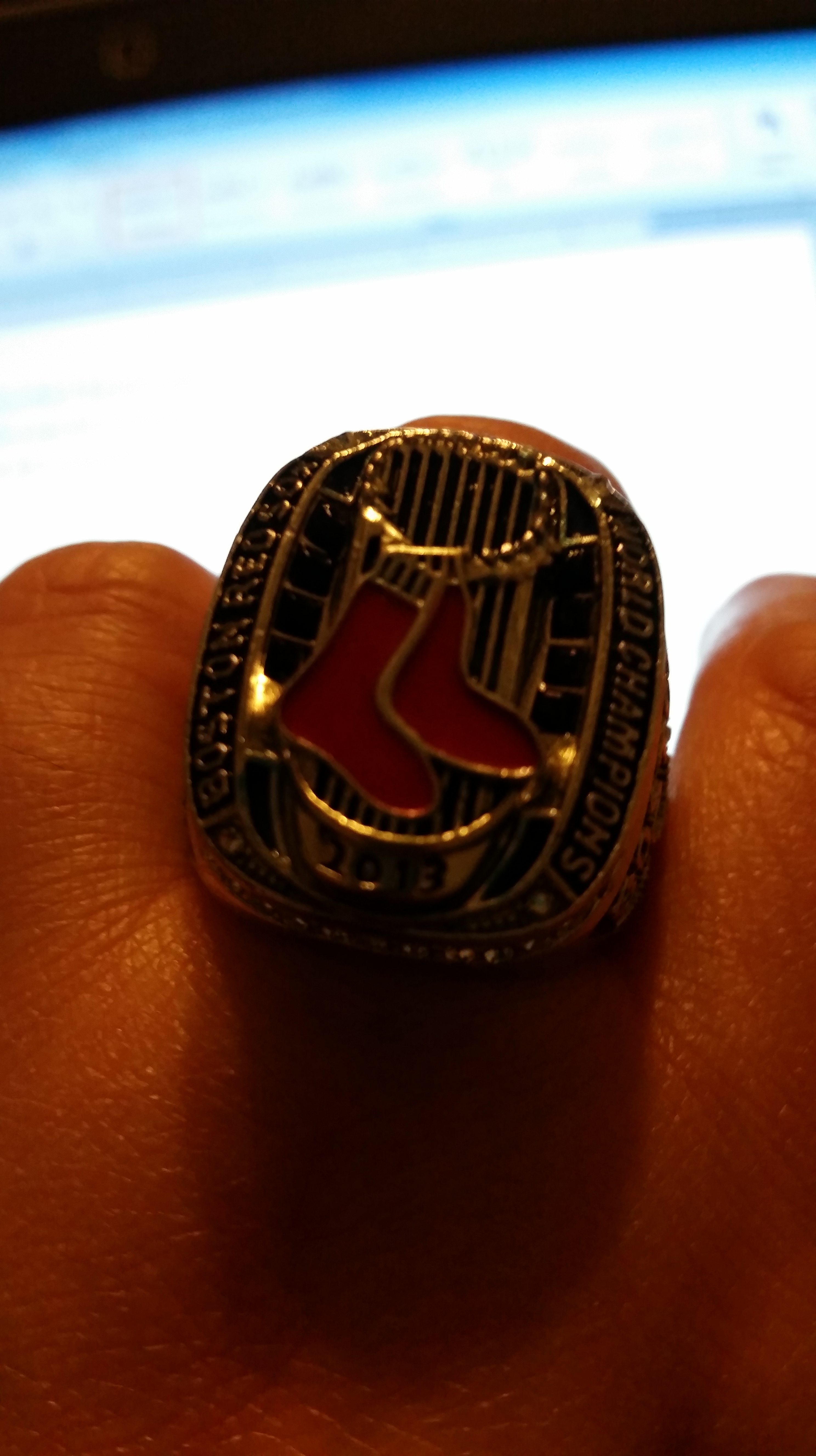 Yesterday, I went over my cousins that I haven’t seen in a long time. Usually we see each other for special birthdays or some other special occasion. We don’t see each other often enough. One of my cousins gave me a special gift yesterday. I am now the owner of a replica World Series ring of the 2013 Boston Red Sox! I am wearing it as I type this. It is heavy. But I love it just the same. I nearly had a coronary in the car when my cousin gave me the ring. She knows I love the Red Sox very much. I have more Red Sox things than I have any other Boston sports team. I own just one Patriots hat. I lost interest in the Celtics when Larry Bird retired (more than twenty years ago) and I don’t care for hockey. All I know about the Bruins is what I read on Twitter or Facebook. But the Sox to me are special. I have been a fan since I was a little kid and that hasn’t changed. Even when they suck, I still love them. My cousin knows this. I will always treasure this gift. I might not wear it publicly, only because it is huge and heavy, but I will wear it in the house.