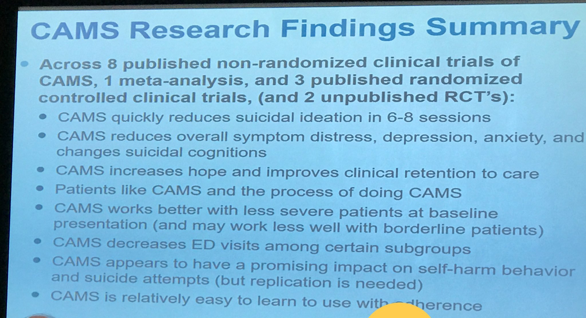 I went on the website for Zero Suicide but could not seem to find the specific training that they went through. From what I gathered on Twitter from their live tweets, some of it is CAMS and some of it is using risk factors for suicide. Unfortunately, risk factors alone are not predictive of a suicide attempt. CBT has been useful in reducing suicide attempts but not all clinicians are trained in this modality. The book by Craig Bryan on CBT for preventing suicide attempts is a good book to learn more about it. I also wrote a review on the book that you can see here.