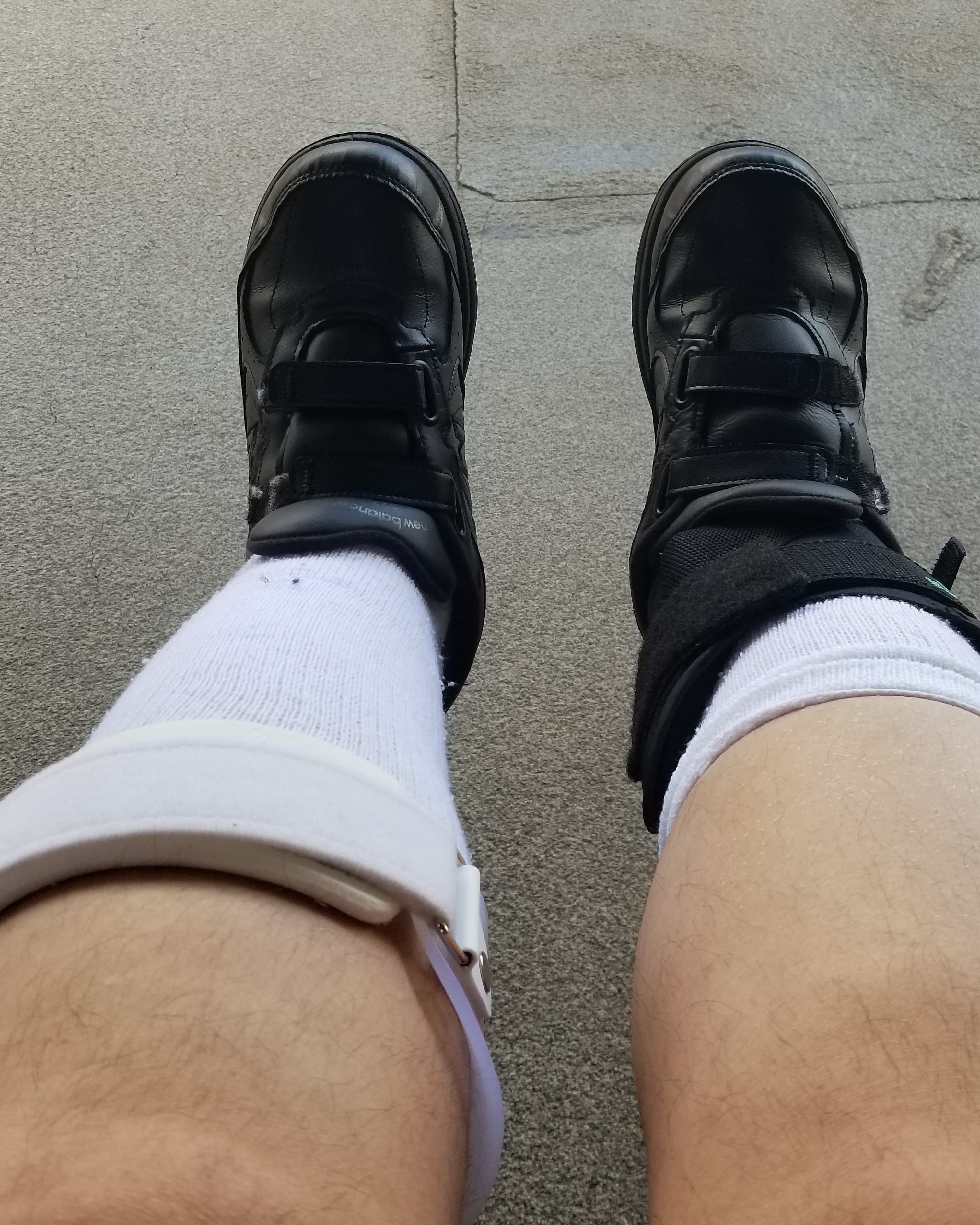 My mother was lying on her bed when I came downstairs to make my dinner. I wanted a turkey sandwich so I made one. I had chips with it. Then I took a cool shower. I felt better after I ate. I realized then I was hangry. I told my mother what my aunt said and she laughed. I was so tired afterwards. I decided to take my meds early and go to sleep. The game had just started and the Snakes scored 4 runs. It didn’t look good. I told my other cousin buona notte, I wasn’t feeling well. In my rush to get some sleep, I forgot to take my night pain meds so I was woken up. Now I can’t go back to sleep. I didn’t plan on writing a blog today but here it is. I feel better now that I wrote about this. The pic is what I now look like with the AFO (ankle foot orthotic) and the air cast. I got to follow up with the doc to find out how long I am to wear it.