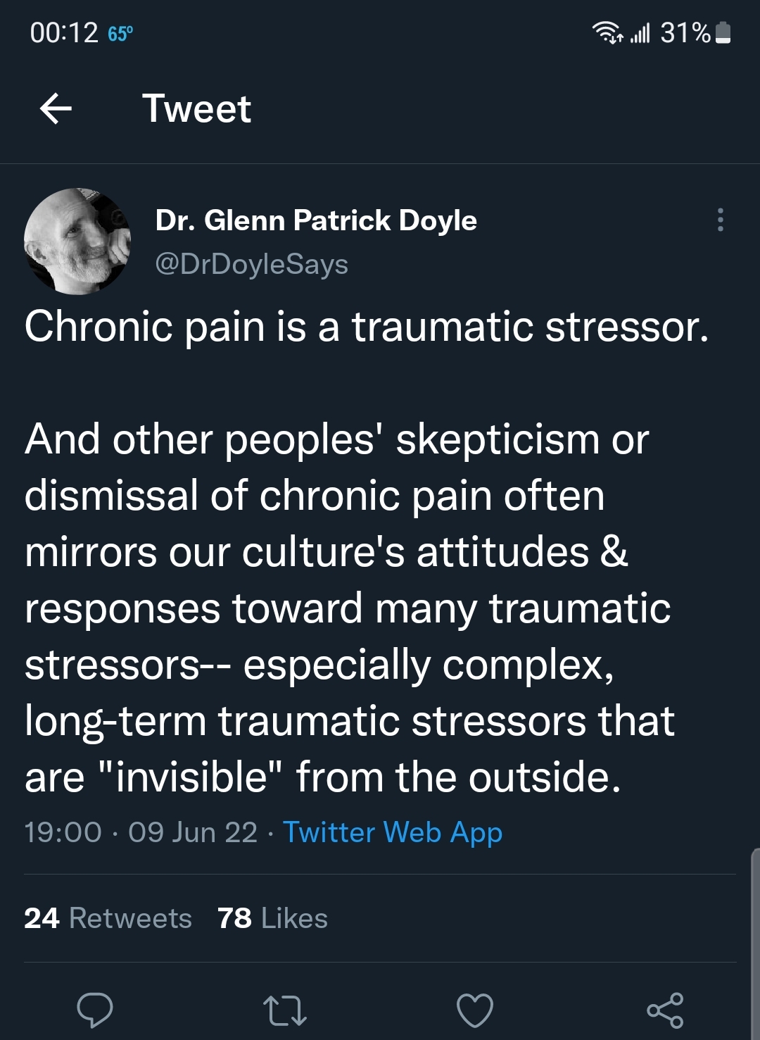 Chronic pain is a traumatic stressor. And other peoples’ skepticism or dismissal of chronic pain often mirrors our culture’s attitudes & responses toward many traumatic stressors– especially complex, long-term traumatic stressors that are “invisible” from the outside. Glen Patrick Doyle