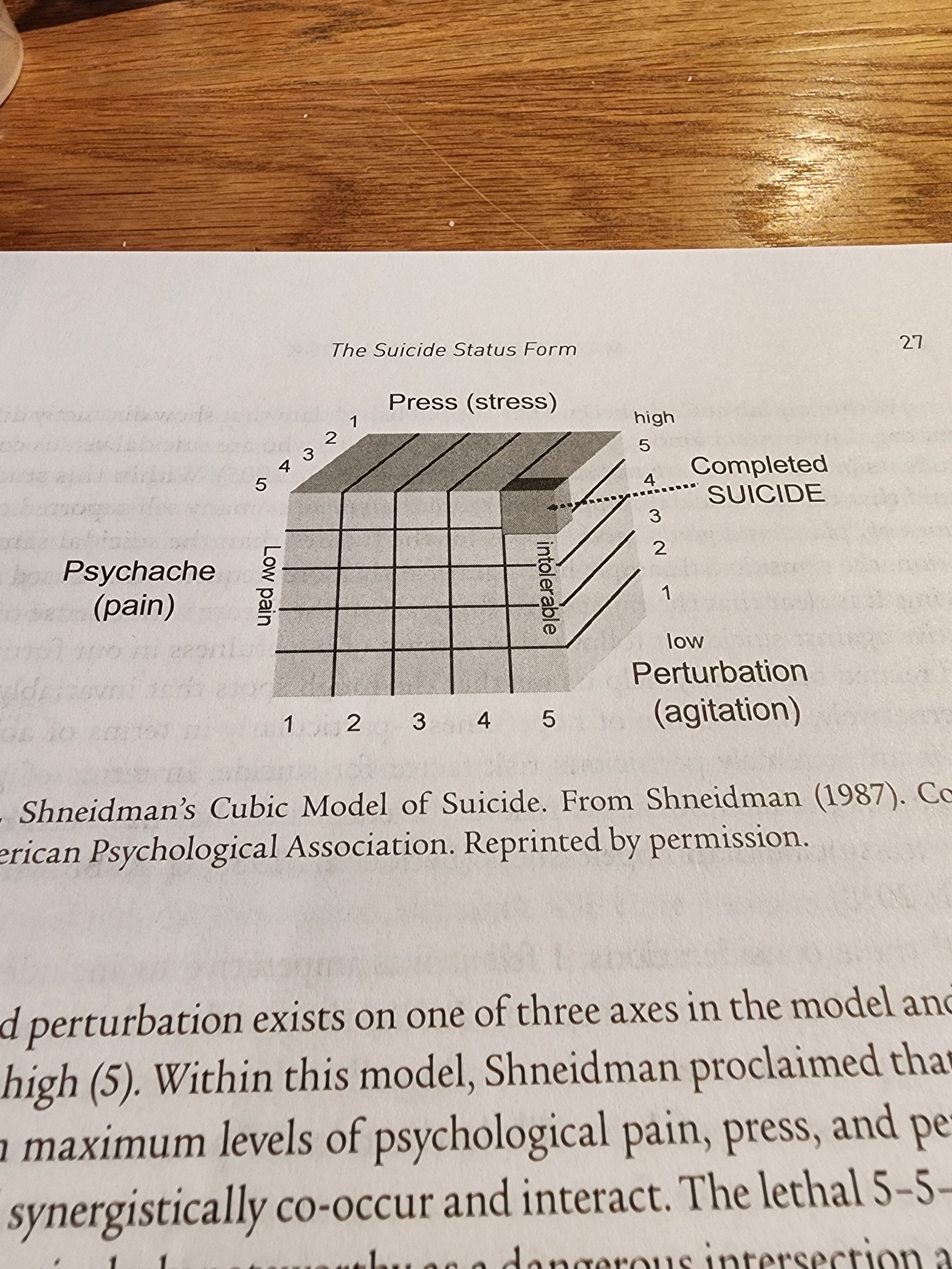 Today marks the 7th month my mother has been dead. It is also my 7th month of being post op for top surgery. I am feeling really sad today. I had to leave the house to get my meds. I honestly didn’t want to leave the house but I forced myself to. I had therapy on Thursday and I told her I would look over the cognitive dissonance papers that I got from the hospital last year. I know where the papers are, but I still haven’t retrieved them. I went to Starbucks to hopefully read a chapter but I just read a little bit. In the Chapter was Shneidman’s cubic model of suicide. I sent it to my therapist. I think it would be important to use such a simple scale around my suicidality. I am not really actively suicidal but the thoughts have been crossing my mind. I don’t stay there long like I used to.