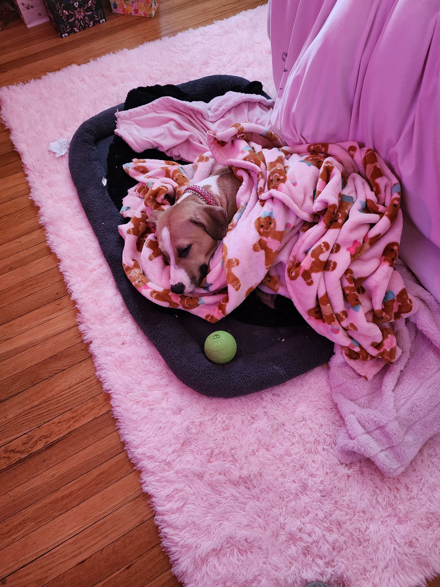 I spent the day with the puppy. I spoiled her. I gave her treats and some eggs which she ate so fast she ended up vomiting them. I wrapped her in a blanket (photo) because she looked cold. I love her so much.