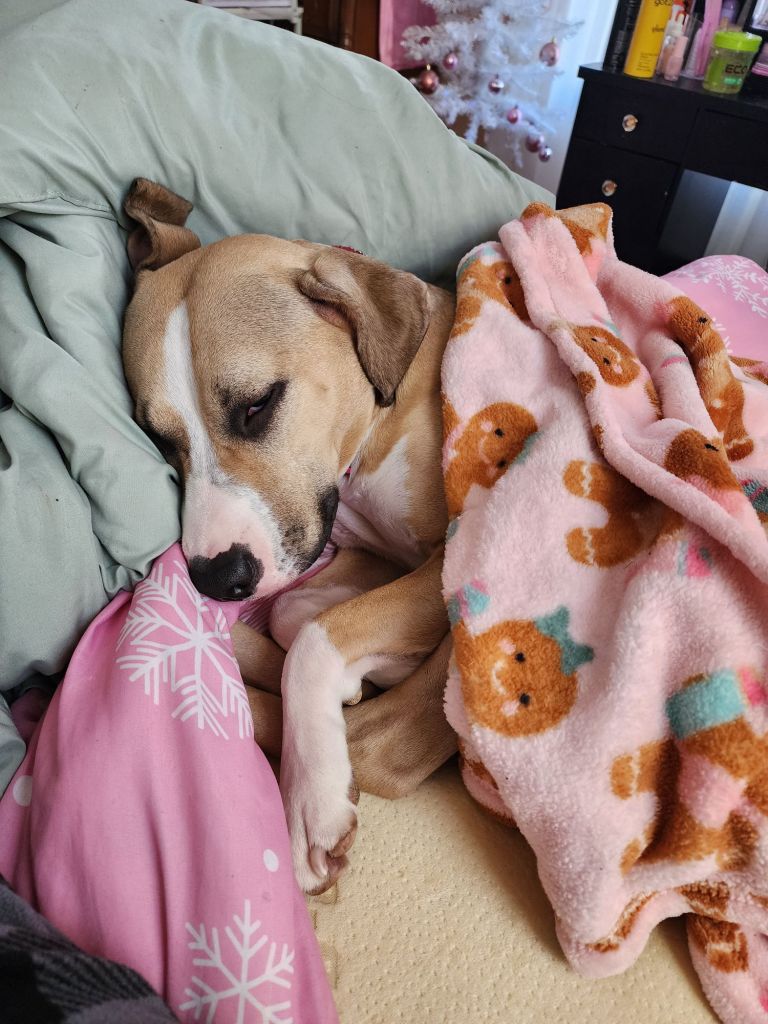 She built herself a fort and then I covered her in the pink blanket.