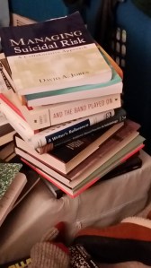 The picture above is of the books to be read. It’s mostly hardcovers so it’s a heavy bunch and I fear it is going to topple over. The pile was higher until I opened my window a few months ago and the pile collapsed when I went to move the hamper behind it. My ankle is hurting so I am not in the mood to adjust the pile so it doesn’t fall. When I take my meds, I probably will adjust it as I will be up anyways. It will be scary to hear a thump in the middle of the night should it fall.