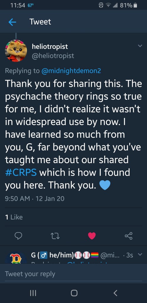 I know I gripe about therapy a lot on my blog but it is how I process what goes on and how I am feeling. Things that happen in therapy stay with me and I go over it to try and deal with it. I have a lot of trauma to sort through and it is still affecting my ability to deal with stuff. My depression is severe and I often think about ending my life. I have been in therapy for nearly thirty years. I think the only thing it has done is keep me alive. I have been hospitalized more times than I can count. I have learned things but sometimes those things don’t come up when I am in a crisis or feeling really bad. This is why I don’t find DBT helpful because when you are in the heat of the moment you aren’t going to reach for a piece of paper or manual for help.